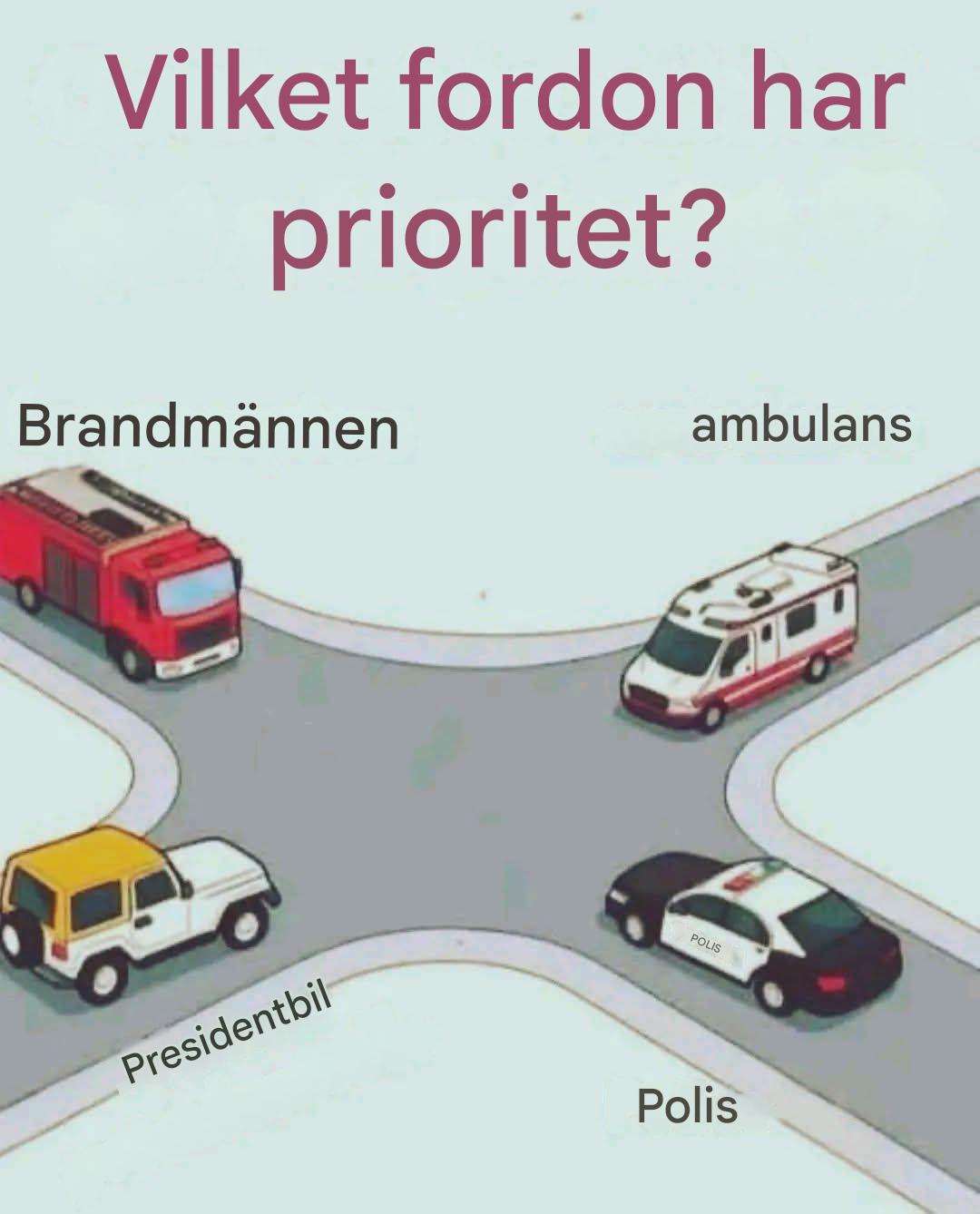 I en korsning dÀr brandbilar, ambulans, polisbilar och ett civilt fordon Àr nÀrvarande uppstÄr ofta en frÄga: vem har egentligen företrÀde?