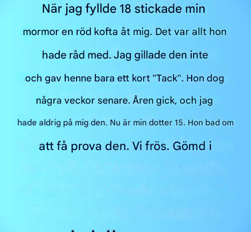 En ung kvinna ärvde en röd kofta från sin mormor. År senare upptäckte hennes dotter gömda konsertbiljetter inuti: en kärlek som diskret förts vidare, bara väntade på att upptäckas.