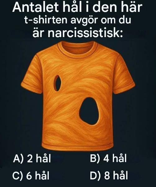 Föreställ dig en knallorange t-shirt som ligger framför dig, med två stora revor framtill. Nedanför, fyra möjliga val: 2, 4, 6 eller 8 hål. Och en titel som väcker nyfikenhet: "Antalet hål du ser på den här t-shirten avslöjar om du är en narcissist." Det är ett påstående! Innan vi drar några psykologiska slutsatser, låt oss ta det för vad det verkligen är: ett roligt litet visuellt pussel, perfekt för att testa våra tankeförmågor (och för att dela fritt på WhatsApp eller över en kaffe).