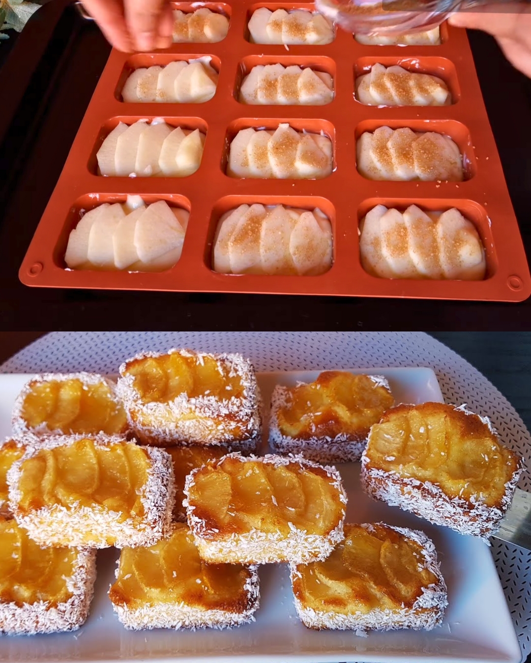 Sikta mjöl och bakpulver och rör ner dem i smeten. Vänd försiktigt ner det hackade äpplet.