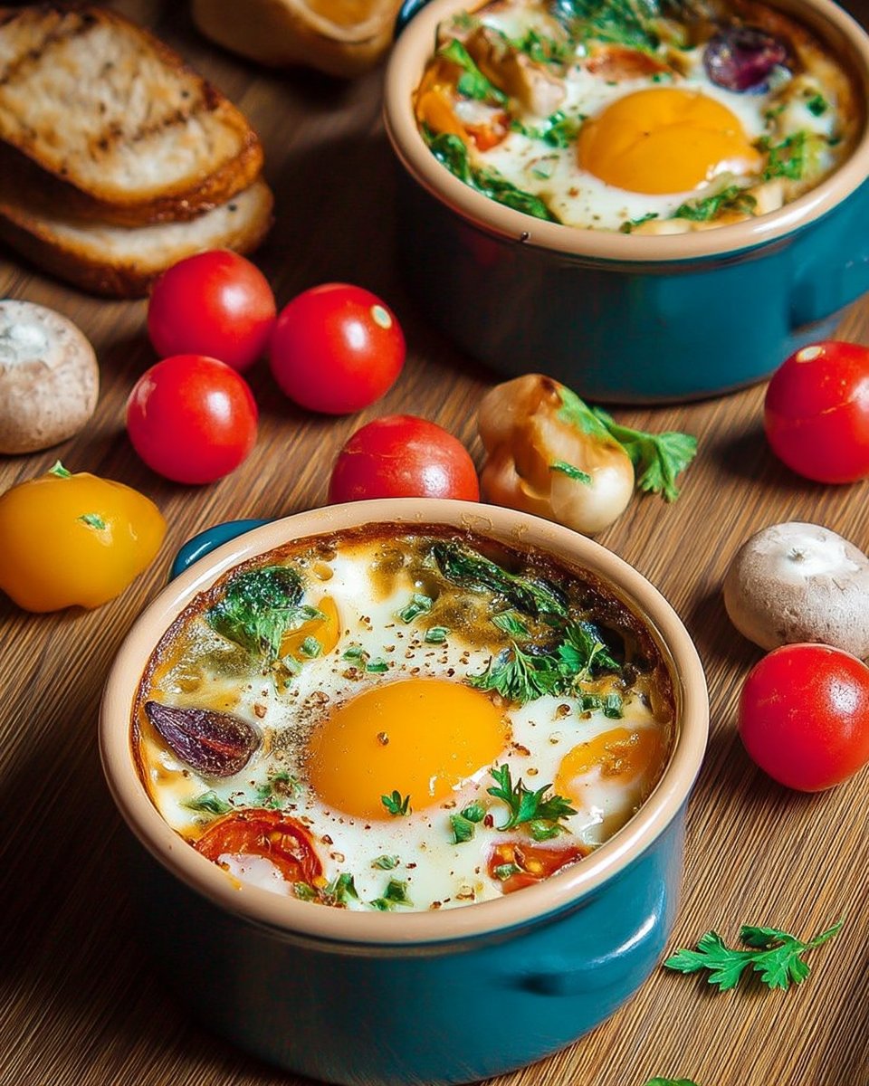 3. Värm ugnen till 180 °C (350 °F). Fördela de kokta grönsakerna i små ramekiner. Tillsätt om så önskas en sked grädde och knäck sedan ett ägg i varje ramekin. 4. Placera ramekinerna i en ugnsform fylld med lite varmt vatten och grädda i cirka 10 till 12 minuter, tills vitan har stelnat och gulan fortfarande är rinnig. Strö eventuellt över lite persilja före servering. Servera med rostat bröd att doppa i gulan. Smaklig måltid!