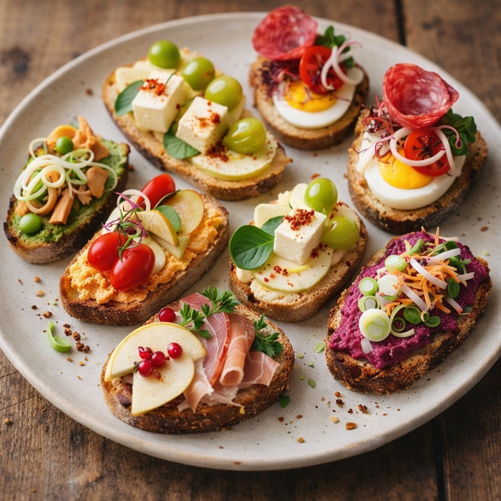 Arrangera alla rostade bröd på ett stort fat, alternera färger och former. Lägg till några basilikablad, persiljeblad eller salladslökskivor här och där för en fin finish. Servera omedelbart, medan brödet fortfarande är lite krispigt.