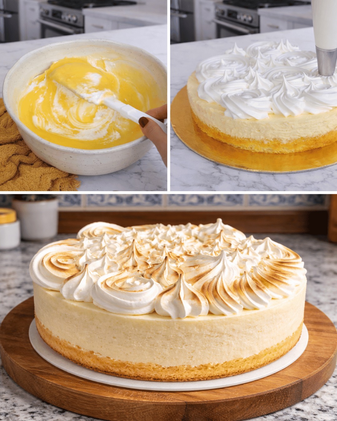 Bred all citronkräm över den avsvalnade sockerkakan. Täck generöst med marängen och skapa virvlar eller toppar.