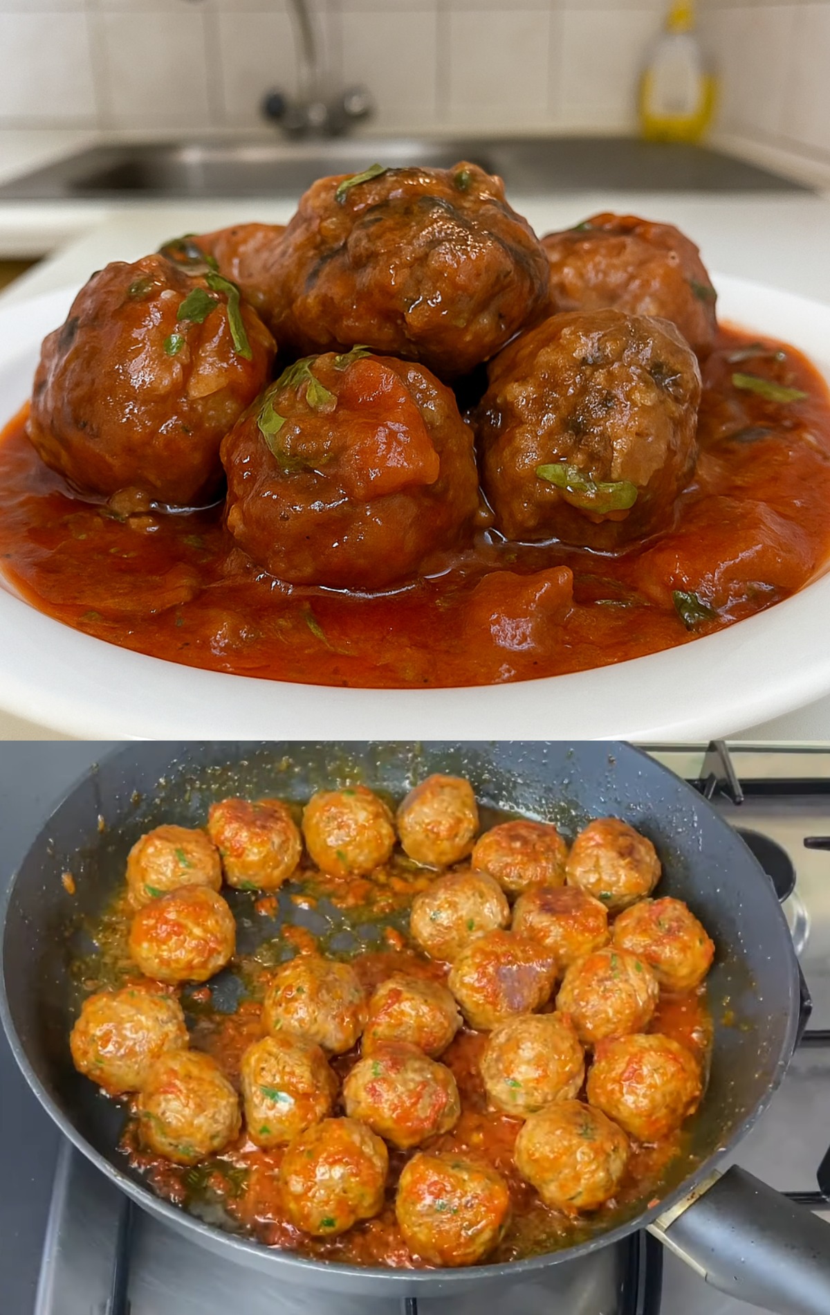 Lägg köttbullarna i en ugnssäker form. Häll tomatsåsen över dem.