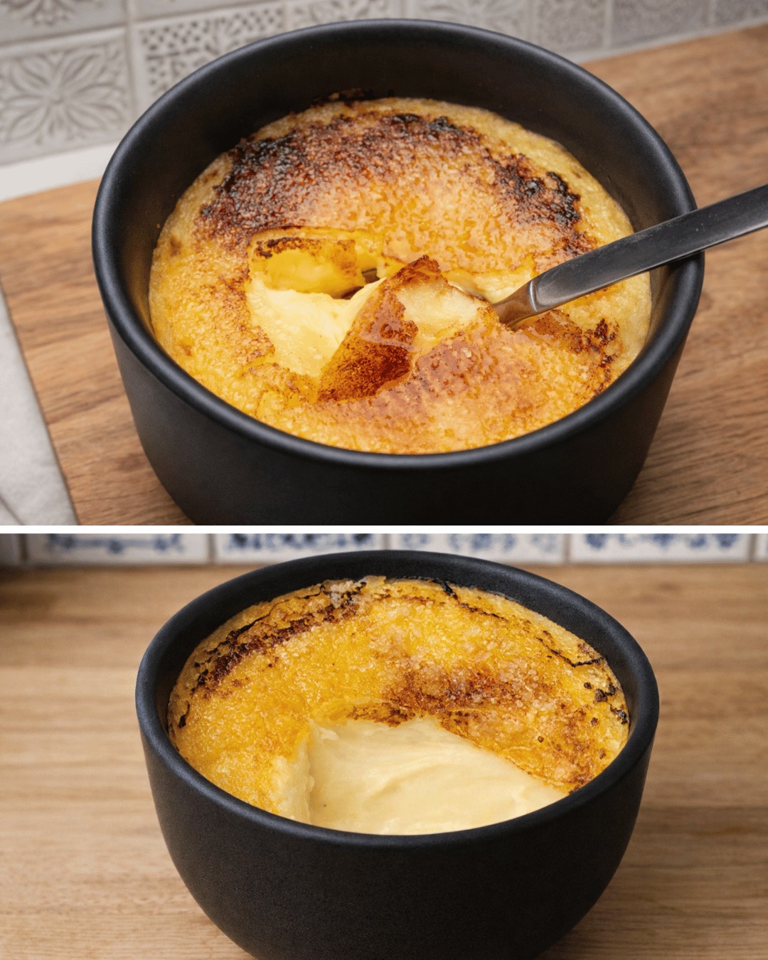 Grädda i 50 till 60 minuter, tills crème brûléen har stelnat runt kanterna och fortfarande är lite vinglig i mitten.