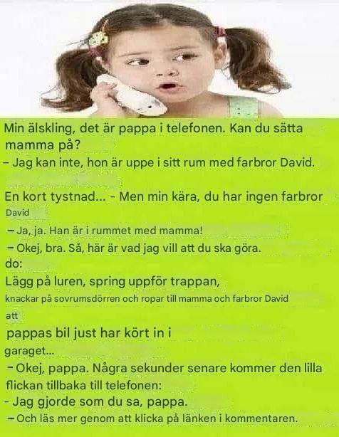 En man försöker prata med sin fru (1/14) En man ville desperat prata med sin fru för att fråga henne något. Han var inte hemma. Så han tog fram sin telefon och slog ett nummer för att nå henne. En liten flicka svarar (2/14) Efter några sekunder svarade någon. Det var en liten flicka. Pappan frågade henne sedan: "Hej älskling, det är pappa i telefonen... Kan du sätta mamma på?" I sovrummet med farbror David (3/14) I det ögonblicket gjorde den lilla flickan en uppenbarelse han inte förväntat sig. Hon sa till honom: "Jag kan inte, hon är uppe i sitt rum med farbror David." Vem är farbror David? (4/14)