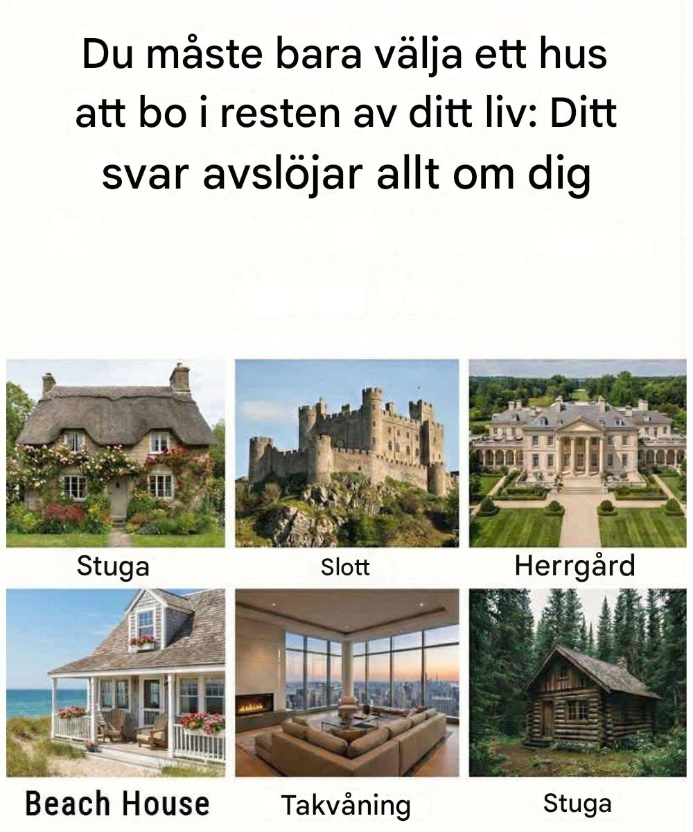 Vid första anblicken verkar den här frågan enkel – nästan lekfull. En stuga, ett slott, en herrgård, ett strandhus, en takvåning eller en stuga. Bara ett val. Men sanningen är att det hem du dras till säger mycket mer om dig än din smak inom arkitektur. Det återspeglar dina värderingar, dina känslomässiga behov och hur du ser din plats i världen.