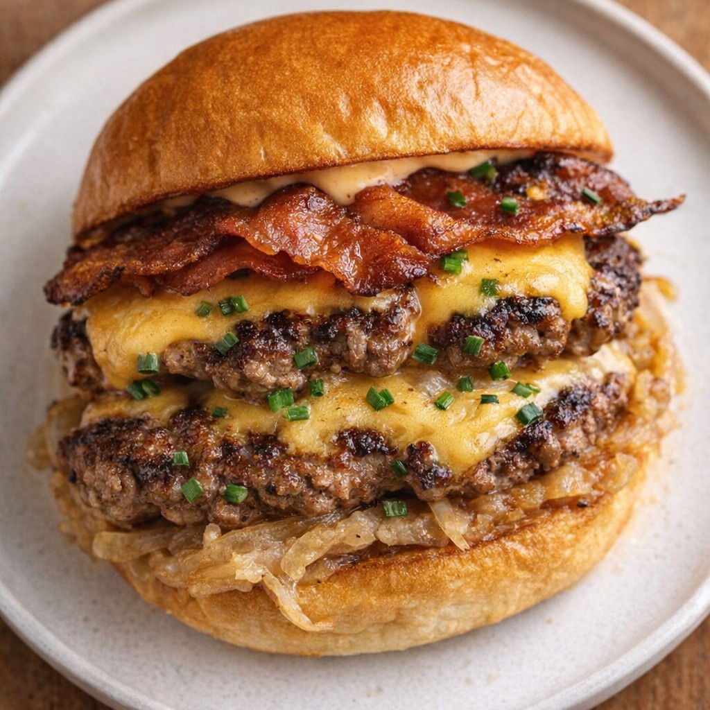 9ïžâŁ â±ïž **Vila och skiva:** LĂ„t smörgĂ„sen vila i 1 minut sĂ„ att saften stabiliseras och osten smĂ€lter nĂ„got mellan biffarna. SkĂ€r i halvor om sĂ„ önskas och servera omedelbart för att njuta av den varma, smĂ€lta och krispiga kontrasten.