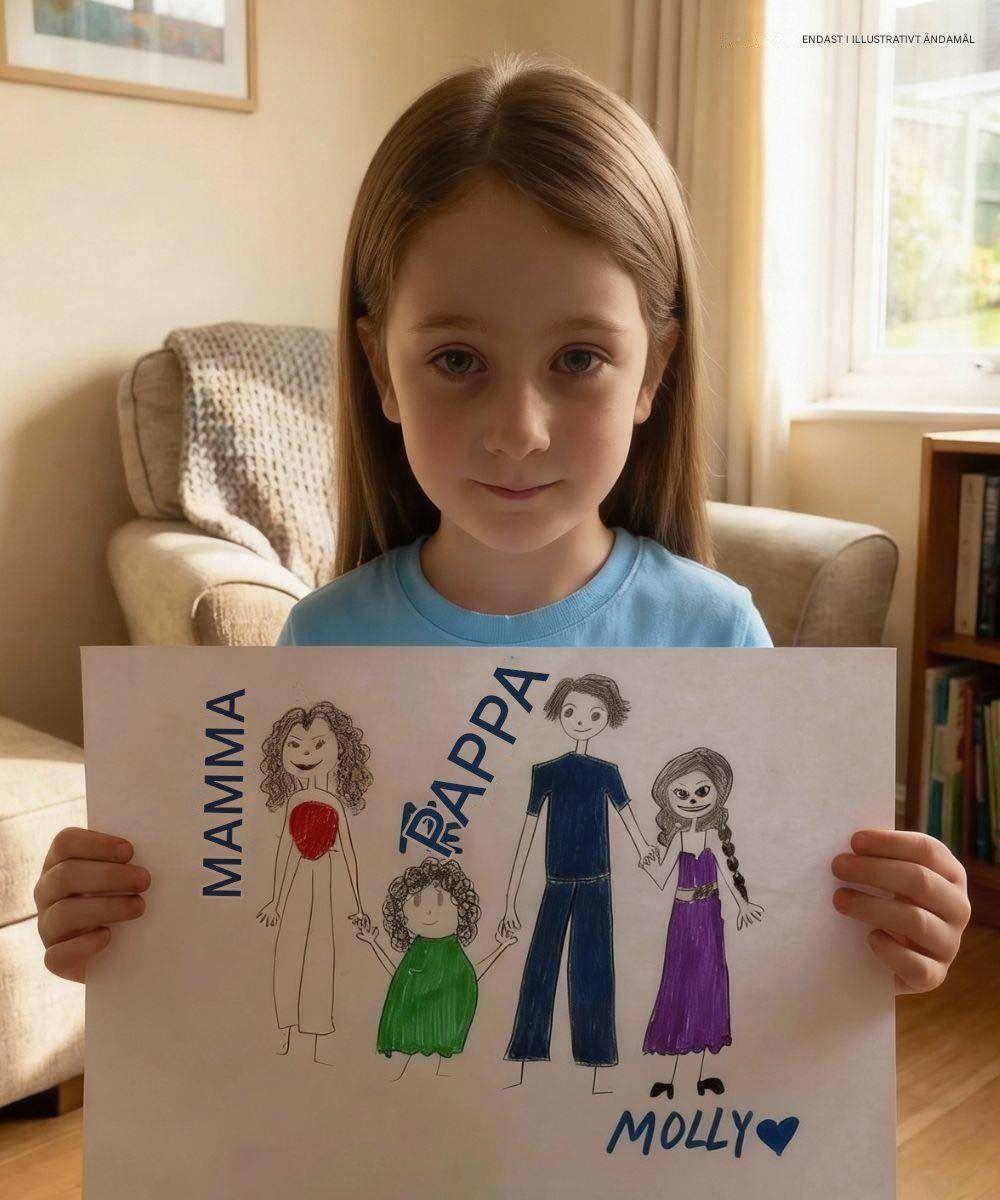 Och en annan kvinna – ritad längre än mig, med långt hår, en ljusblå klänning och ett enormt leende.