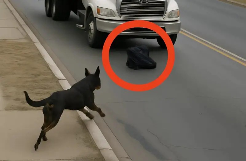 Långt ifrån att springa iväg gick hunden snabbt mot ett mörkt föremål som låg på vägen. Den skällde fortfarande och cirklade runt en sportväska som placerats direkt på asfalten. Föraren, nyfiken, närmade sig och lade märke till att väskan var orörd… men verkade innehålla något.