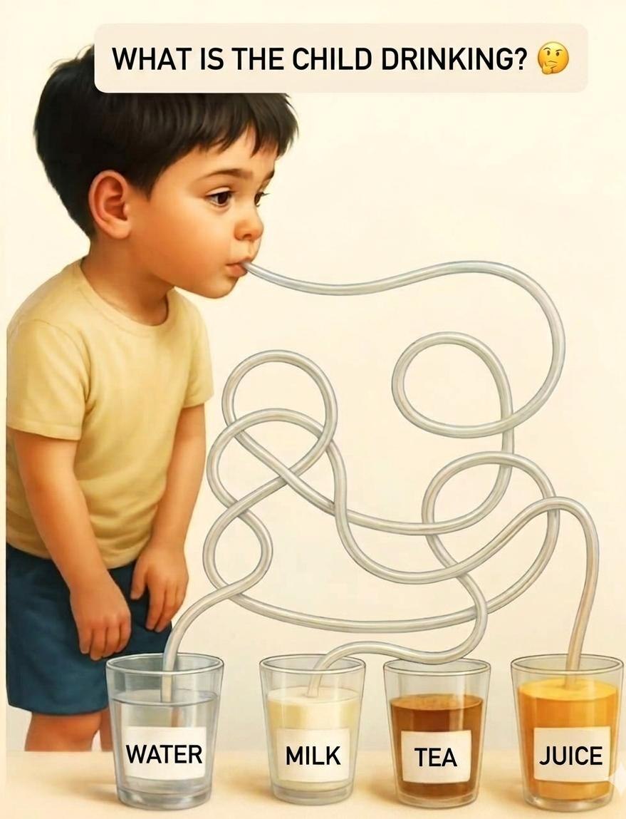 Vid första anblick verkar bilden enkel: ett barn dricker genom ett långt rör som är kopplat till fyra olika drycker – vatten, mjölk, te och juice.