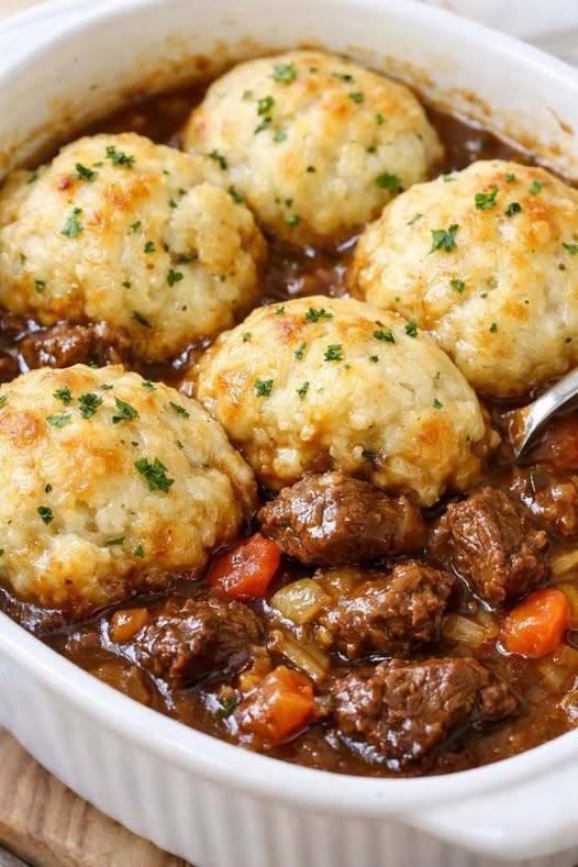 Denna ugnsbakade 4-ingredienser Amish-nötkötts- och dumplinggryta är ren comfort food som förvandlar rejält grytkött till möra, smältande bitar genom en långsam, mild gräddning. Nötköttet sjuder i en rik blandning av svampsoppa och löksoppa, vilket skapar en smakrik sås som utvecklas medan det sjuder. Toppade i slutet med kärnmjölksdeg, gräddas kexen gyllenbruna på toppen medan de suger in de goda safterna under, vilket ger dem en mjuk, dumplingliknande konsistens.