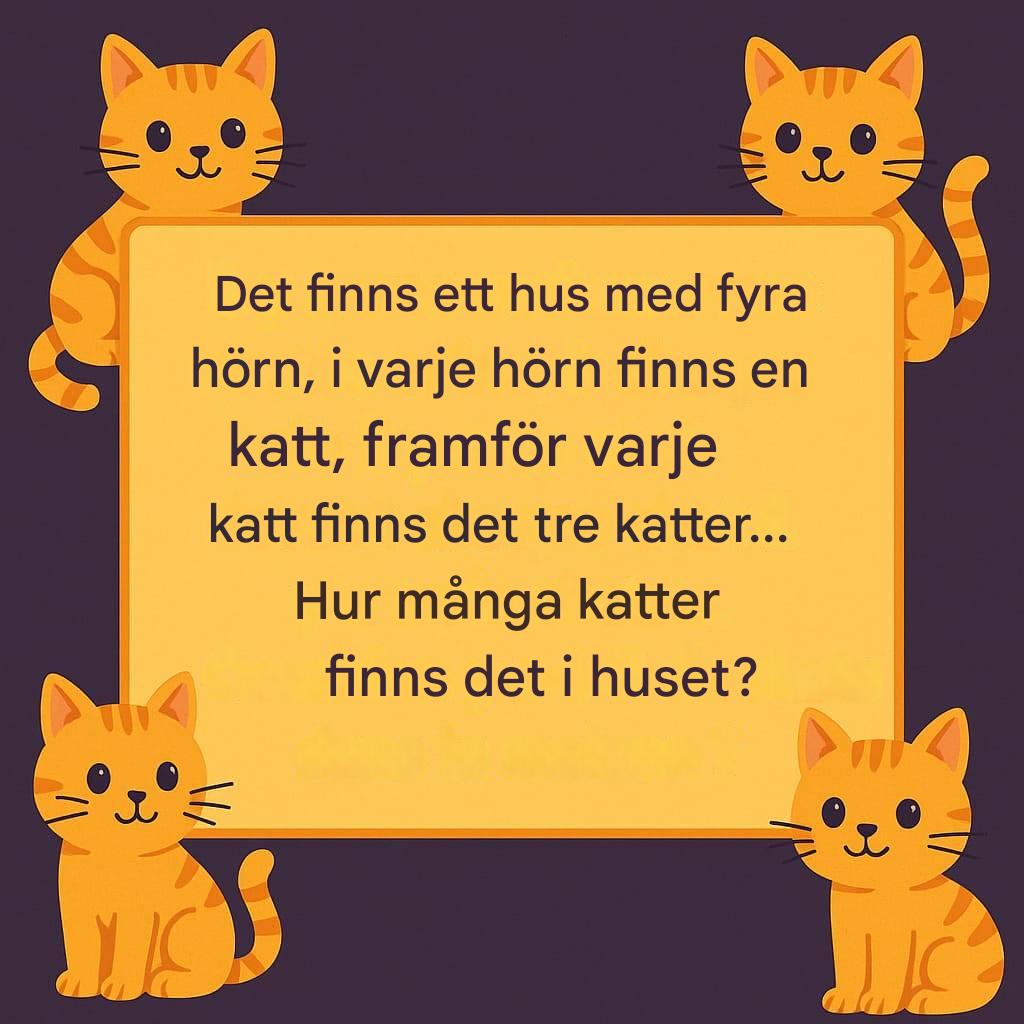 Det finns ett hus med fyra hörn. I varje hörn finns en katt, och framför varje katt finns tre katter…