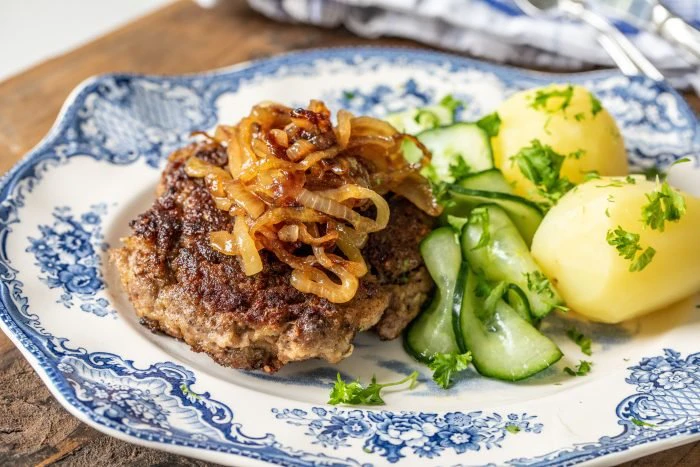 Husmanskost när den är som bäst! Färsbiff med karamelliserad lök, pressgurka och potatis. Så otroligt gott! Receptet på pressgurka hittar du här: Pressgurka