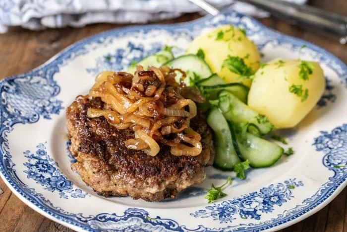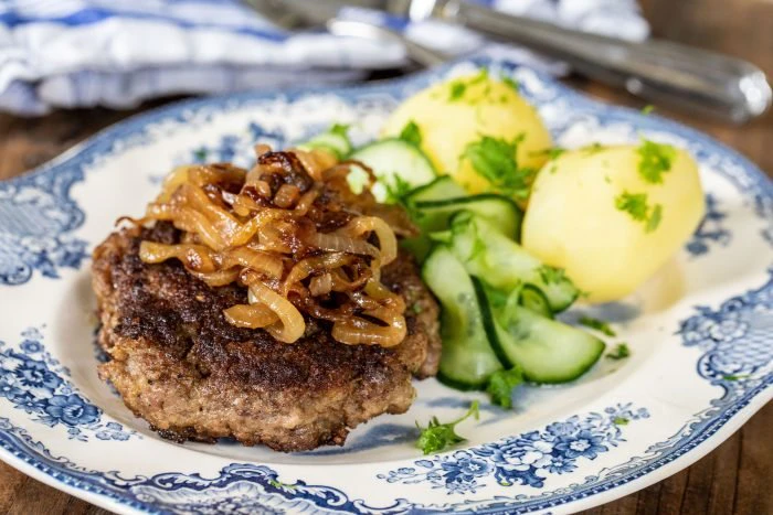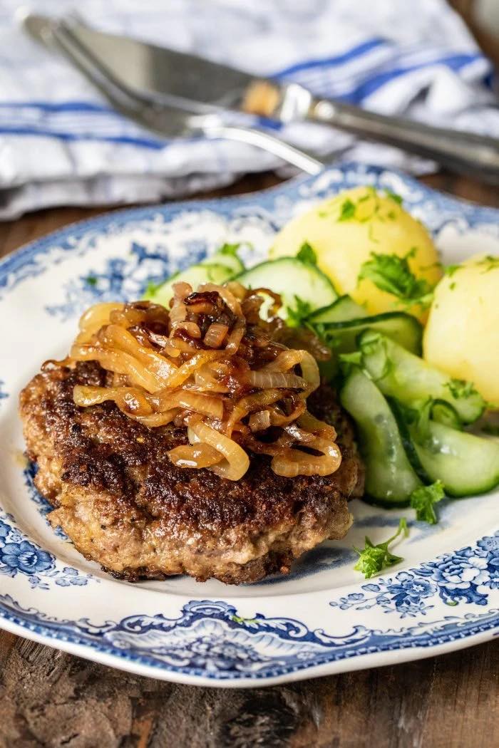 Husmanskost när den är som bäst! Färsbiff med karamelliserad lök, pressgurka och potatis. Så otroligt gott! Receptet på pressgurka hittar du här: Pressgurka