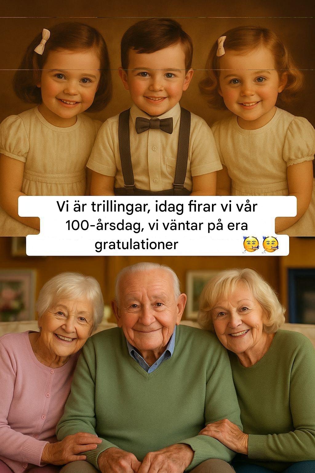 För hundra år sedan började tre hjärtan slå som ett. Sedan den dagen har vi vuxit sida vid sida – delat vår barndom, våra drömmar, våra prövningar och våra glädjeämnen. Tiden har lärt oss att varje ögonblick är en gåva… och att det är en ovärderlig välsignelse att nå denna punkt, fortfarande förenade. Idag firar vi ett sekel av minnen. Vi är trillingar – med hundra år av liv som skulle kunna fylla många kapitel. Våra steg är långsammare, men våra ögon lyser fortfarande lika starkt som på det där första barndomsfotot. På denna alldeles speciella dag är det vi hoppas på enkelt: några ord från dig. För med tiden har vi förstått en viktig sak: det som verkligen spelar roll är vad vi sår i andras hjärtan.