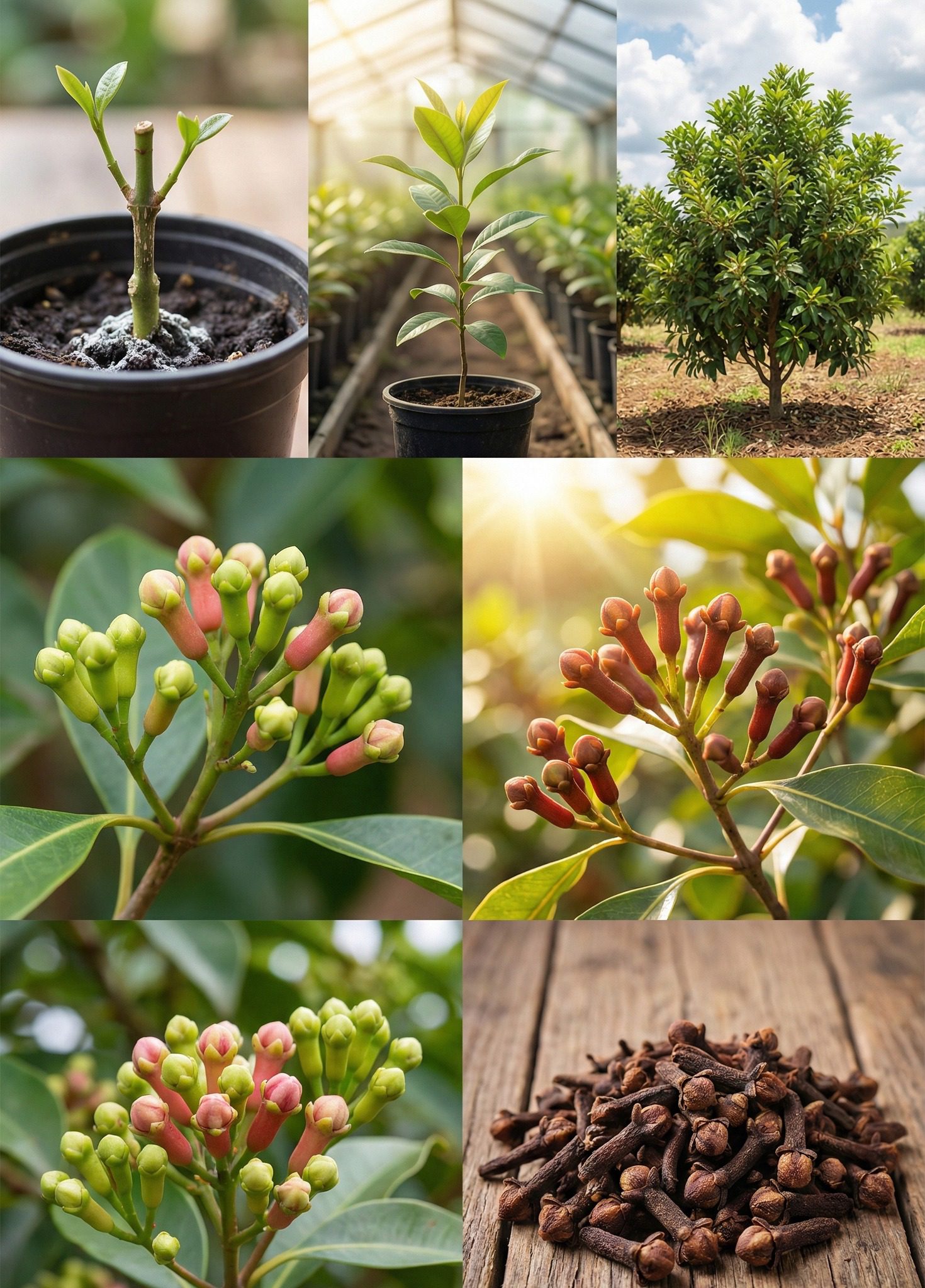 Kryddnejlikeplantor växer långsamt och det kan ta 3–6 år innan de producerar blomknoppar som är redo för skörd. Regelbunden skötsel är avgörande: vattna regelbundet, håll varma och fuktiga förhållanden och gödsla med några veckors mellanrum. Övervaka växterna för skadedjur eller sjukdomar och se till att luftflödet är bra för att förhindra mögel- eller svampproblem. Korrekt skötsel resulterar i starka stjälkar, frodigt grönt bladverk och så småningom aromatiska blomknoppar.