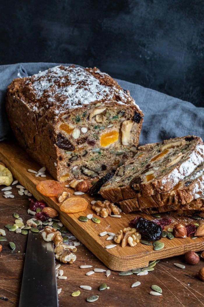 Saftigt gott bröd med fröer och torkad frukt