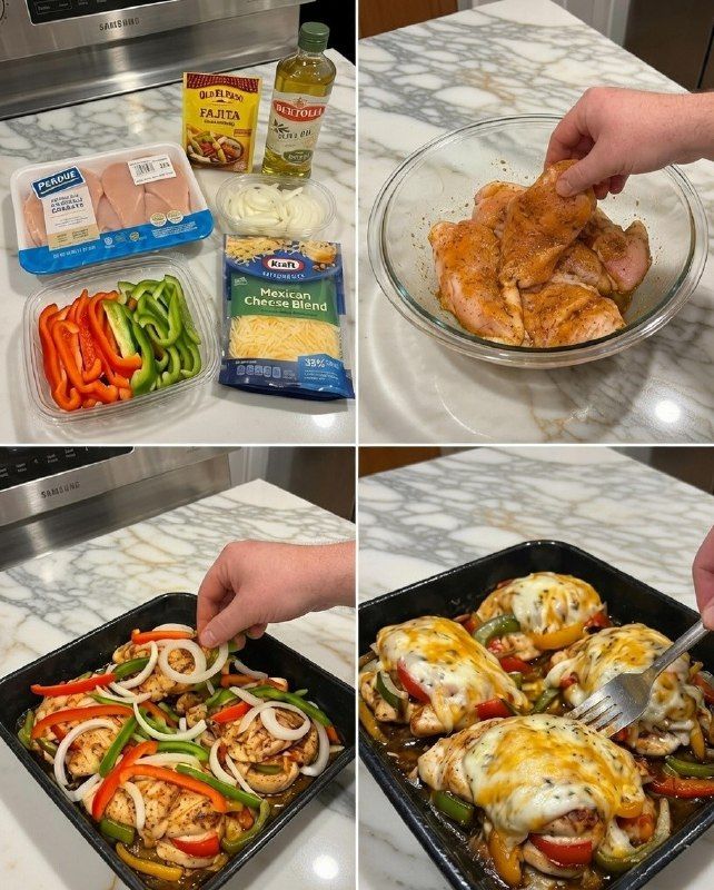 Grillad paprika, saftig kyckling och ett generöst lager smält ost: detta är den perfekta enkla och smakrika middagen som ger dig den intensiva smaken av fajitas direkt från ugnen.