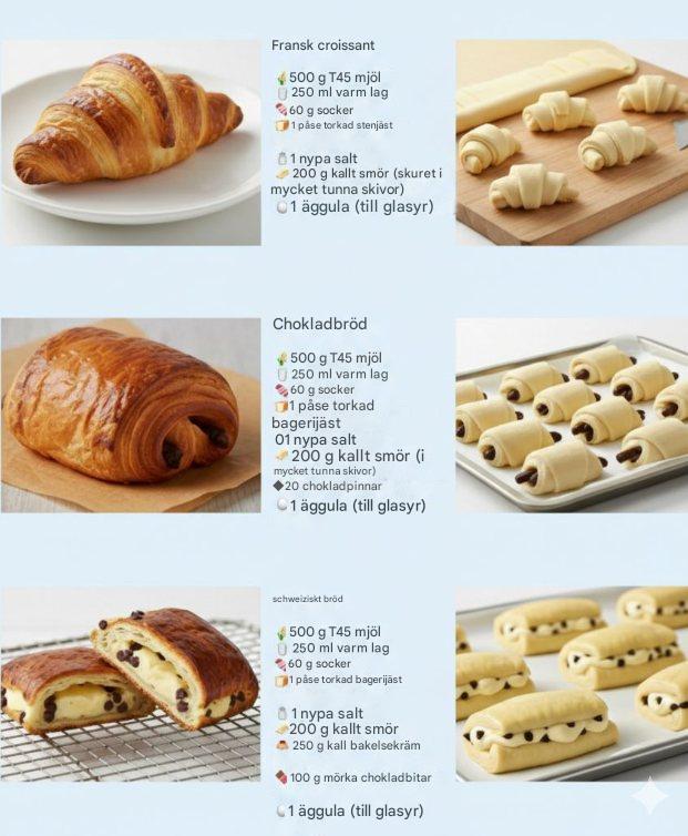 Schweizerbröd använder samma smördegsbotten som croissanter, men med en rik fyllning av bakgrädde och chokladbitar.