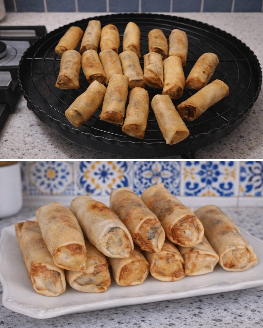 Låt de okokta vårrullarna vila i kylskåpet i 10 minuter innan de friteras.