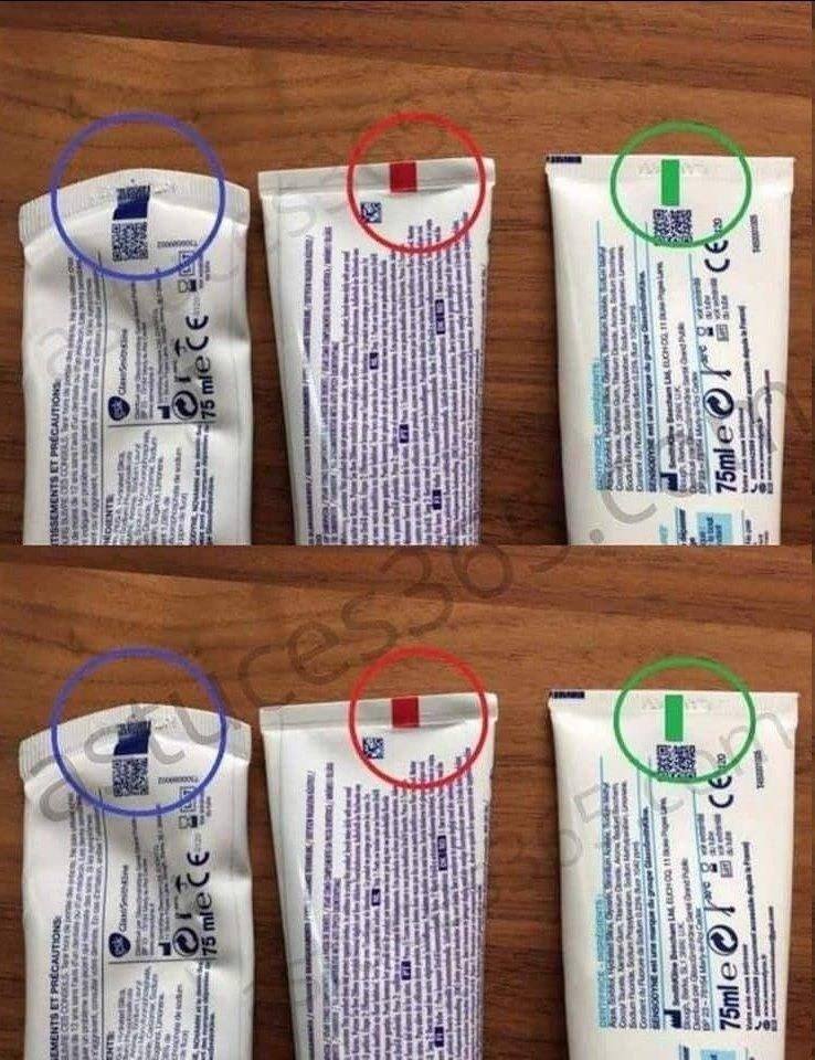 Detta har en något sämre färg än blå tandkräm. Tandkräm med en röd rand indikerar att den innehåller en kombination av naturliga och syntetiska kemiska föreningar. Generellt sett vill man ha så få kemikalier i sitt liv som möjligt.