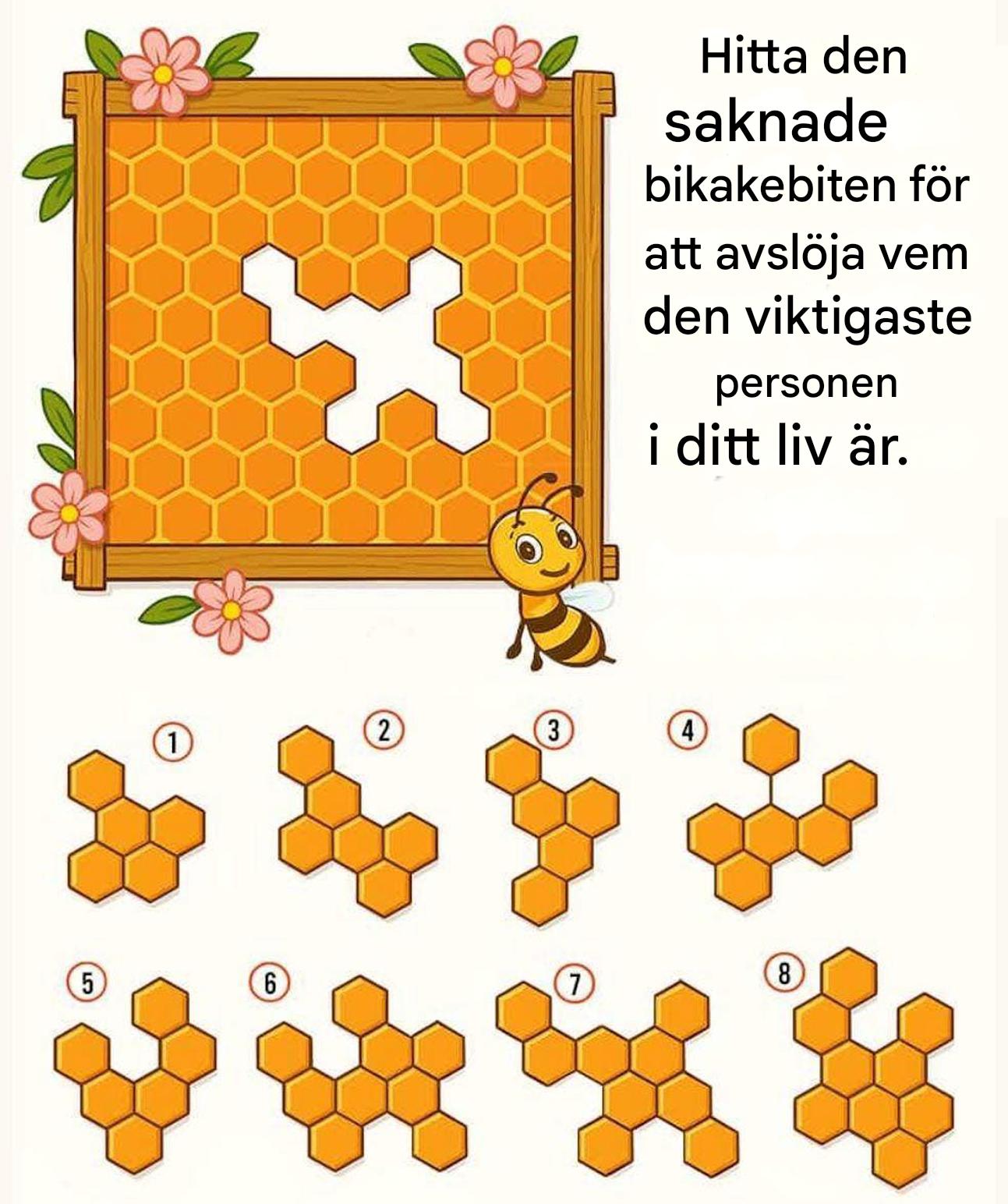 Har du någonsin stött på de där visuella testerna som verkar oskyldiga innan de avslöjar något oväntat? Det här fungerar på samma sätt. En bit saknas i ett bikakepussel, och du har åtta alternativ. Ditt uppdrag verkar enkelt: välj instinktivt den bit som fyller tomrummet. Men det här valet kan avslöja mycket mer än du föreställer dig… Vad avslöjar det om personen som delar ditt liv i en bredare bemärkelse – vän, närstående eller tyst, vardagligt stöd? Håll utkik…