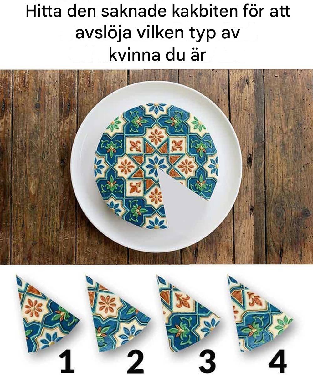Personlighetspussel baserade på visuella val har blivit extremt populära eftersom de kombinerar observation, intuition och lite självreflektion. Bilden ovan visar en vackert mönstrad kaka där en bit saknas. Under den finns fyra olika bitar som kan passa perfekt in i det tomma utrymmet.