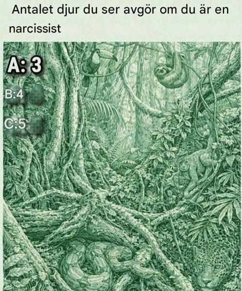Vad denna djungellusion verkligen avslöjar om narcissism Vid första anblicken ser denna djungelillustration ut som en typisk tät skog – slingrande rötter, hängande lianer och lager av lövverk. Men gömda bland lövverket finns flera kamouflerade djur som väntar på att bli upptäckta. Den djärva rubriken hävdar: "Antalet djur du ser avgör om du är en narcissist." Alternativ: A: 3 B: 4 C: 5 Det är ett spännande påstående – men betyder det egentligen något? Låt oss bryta ner det. Att upptäcka de gömda djuren Om du tittar noga kan du hitta: En tukan som sitter på en gren En sengångare som hänger från en gren A…