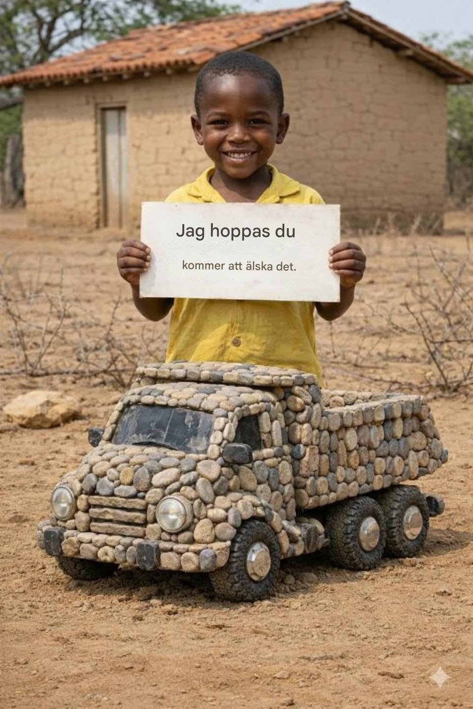 Jag har inga fjärrstyrda bilar eller fina leksaker från butiker, men jag har min fantasi, och min trädgård är fantastisk. Titta vad jag har byggt! Med mycket tålamod har jag byggt min egen bil, bit för bit. Den är unik, och jag är så stolt över mitt konstverk. 🚗🚗👦