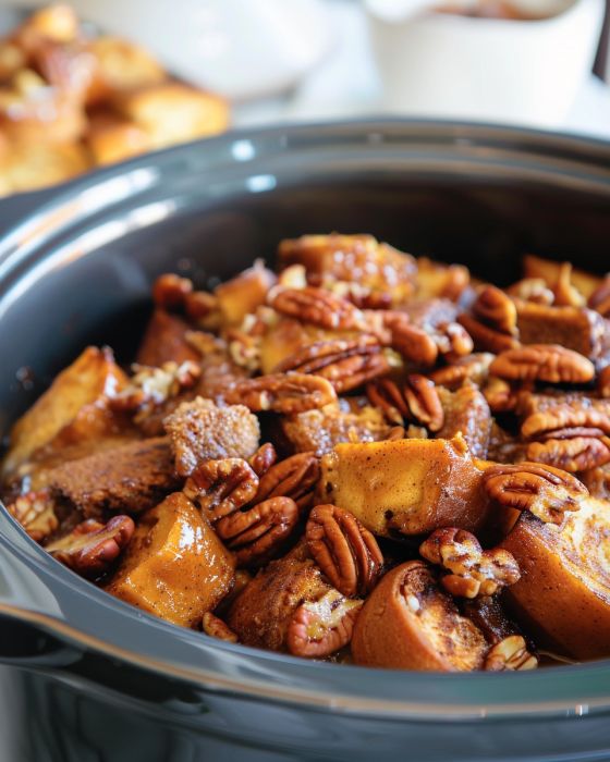 4. Häll äggblandningen jämnt över kanelbullebitarna i slow cookern och strö sedan över pekannötter om du använder dem.