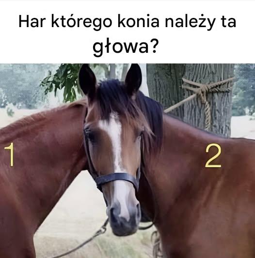 Nasz mózg uwielbia działać szybko. Analizuje, podejmuje decyzje, klasyfikuje... czasami troę za szybko. W tej iluzji wydaje się oczywiste, że koń po lewej stronie jest na pierwszym planie. Igo spojrzenie, postawa, wszystko zdaje się na to wskazywać. Ale zwolnij trochę. Observewuj całość, inte tylko glowy. Możesz być zaskoczony.