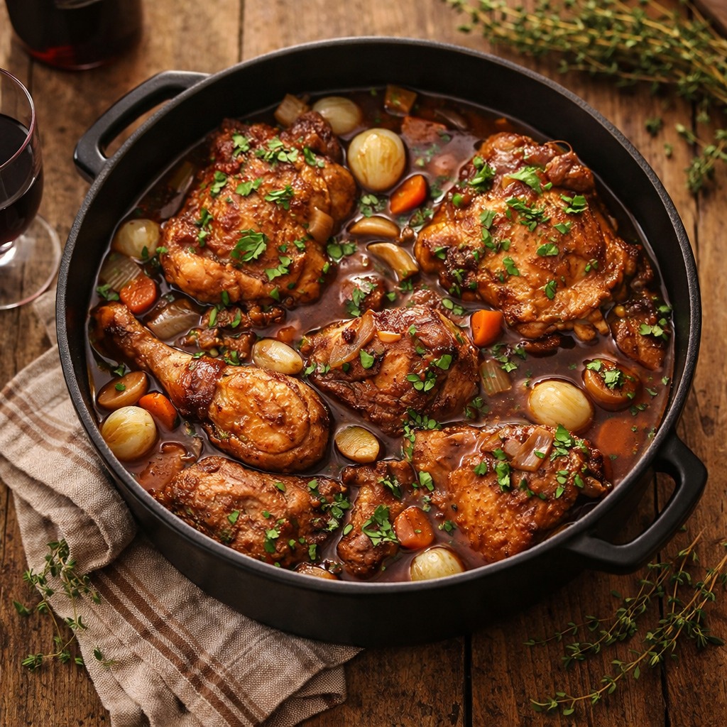 **: NĂ€r kycklingen Ă€r mycket mör (köttet lossnar lĂ€tt frĂ„n benet), ta ut den och hĂ„ll den varm. Ta bort timjan/lagerblad. LĂ€gg tillbaka bacon, pĂ€rllök och svamp i grytan. Sjud sĂ„sen utan lock i 8â12 minuter pĂ„ medelvĂ€rme tills den tĂ€cker baksidan av en sked. Smaka av och justera kryddningen med salt och peppar.