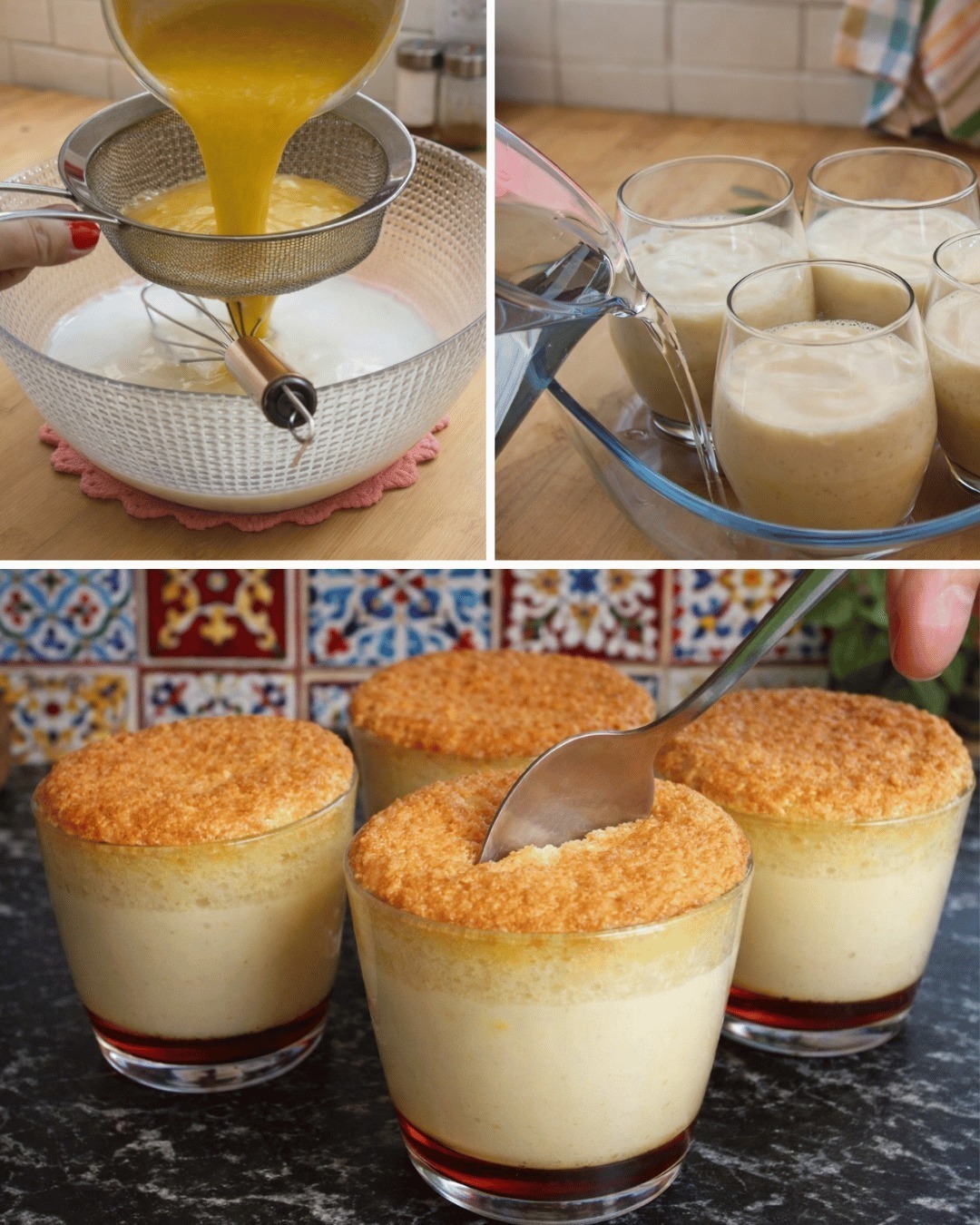 Häll omedelbart karamellen i botten av värmetåliga ramekiner. Ställ åt sidan.