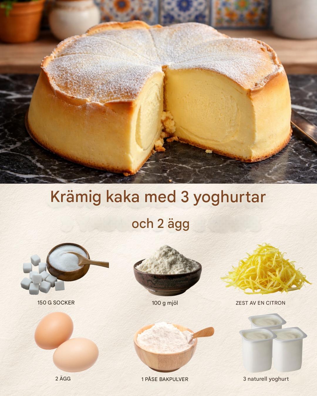 Denna krämiga kaka gjord på 3 yoghurtar och 2 ägg är ett recept du bara måste prova – snabbt, enkelt och perfekt för en lyckad hemlagad dessert. Lätt, fluffig och anpassningsbar efter din smak, den kommer snabbt att bli en favorit.