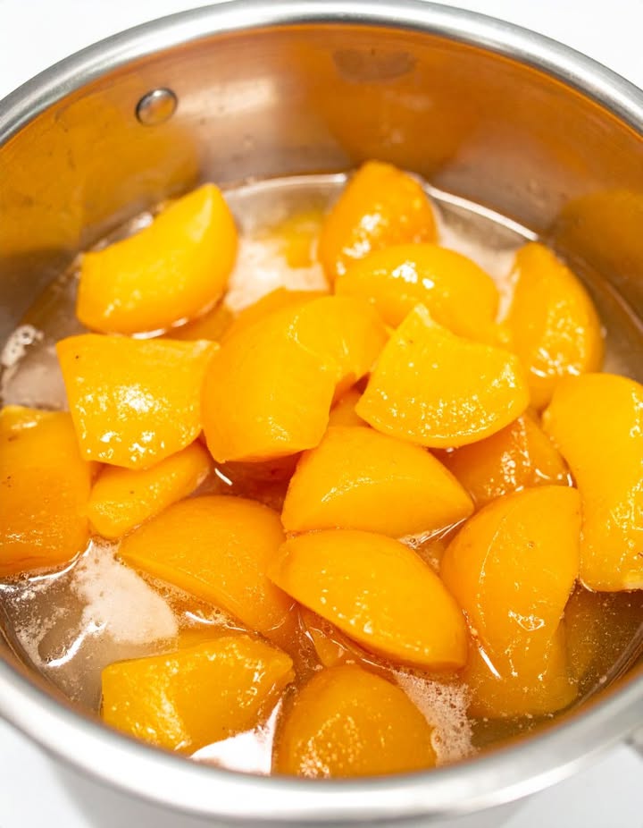 2. Häll de konserverade persikorna, tillsammans med deras sirap, i botten av långkokaren.