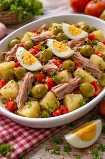 Ingredienser för en medelhavssallad med potatis och tonfisk