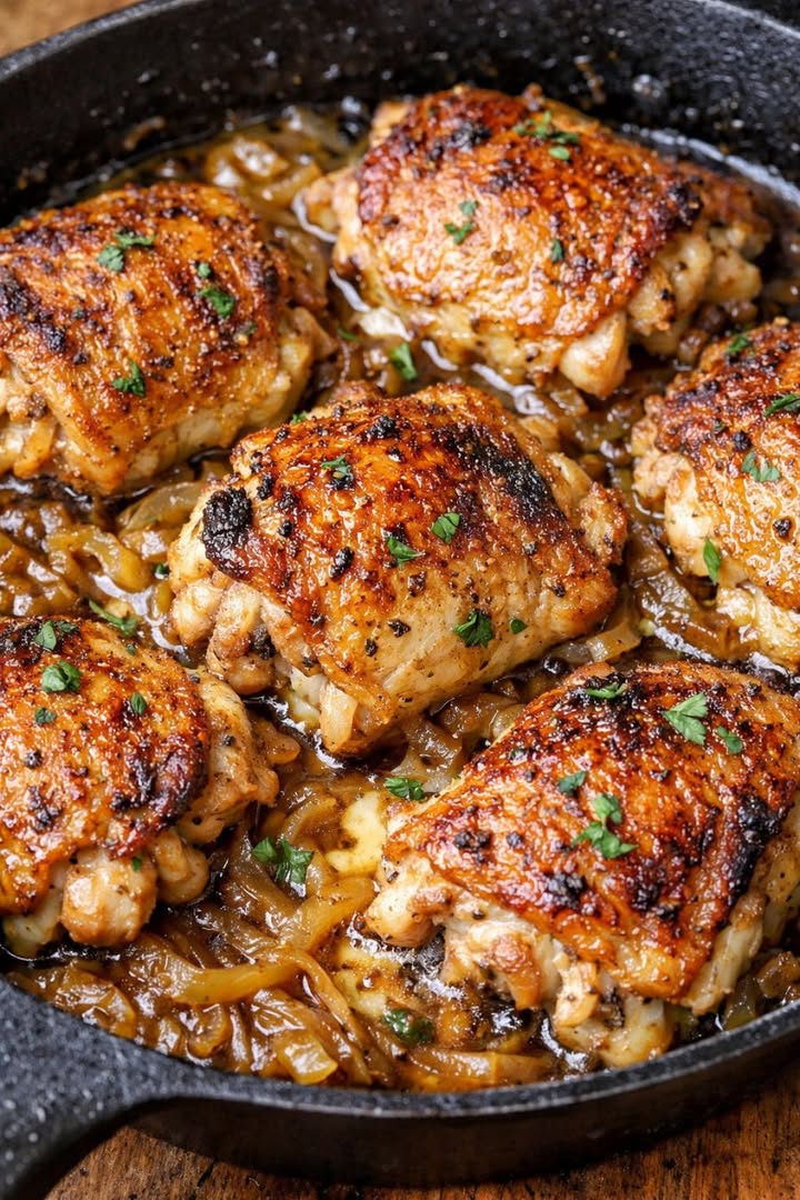 Här är exakt det kycklingreceptet som min svärmor klottrade ner på en servett och gav till mig på min möhippa. Det verkade nästan för enkelt för att vara sant: bara tre ingredienser och en varm ugn. Ändå, 30 år senare, är det fortfarande den enda kycklingen min man ber om till födelsedagar, hektiska vardagskvällar och till och med avslappnade söndagsmiddagar. Löksoppablandningen gör allt jobb: smakrika, perfekt karamelliserade kycklinglår med krispigt, gyllene skinn – allt utan någon ansträngning. Det är den typen av idiotsäkert recept du förvarar gömt i ett skåp för de kvällar när du är trött men fortfarande längtar efter något som ser ut som att det är gjort med omsorg. Servera dessa löksoppablandningsmarinerade kycklinglår direkt från gjutjärnspannan, ringlade med deras karamelliserade saft. De passar perfekt med enkla tillbehör som rostade potatisar, ris eller smörade äggnudlar för att suga upp saften. En krispig grönsallad, ångade gröna bönor eller rostade morötter balanserar rättens fyllighet på ett fint sätt. Om du har gäster, lägg till ett knaprigt bröd och ett glas kylt vitt vin; För en mysig familjemiddag blir potatismos och frysta ärtor en tröstande och komplett måltid som är klar på ett ögonblick.