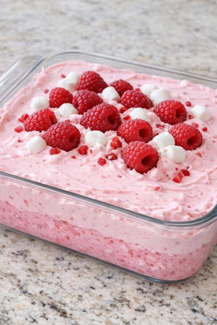 När den är redo att serveras, ta ut rätten ur kylskåpet och låt den stå i rumstemperatur i 5 till 10 minuter så att den inte längre är isig. Servera generöst med en stor sked eller spatel och var noga med att fördela det rosa gräddlagret och de färska hallonen jämnt över. Servera direkt från glasformen så att alla kan beundra dess elegans – du skulle aldrig kunna gissa hur lätt den är att tillaga!