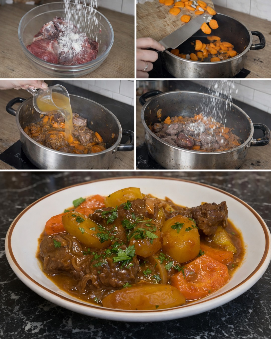 Skär köttet i bitar. Krydda med salt och peppar och strö sedan över 2 matskedar mjöl. Blanda väl för att täcka jämnt.