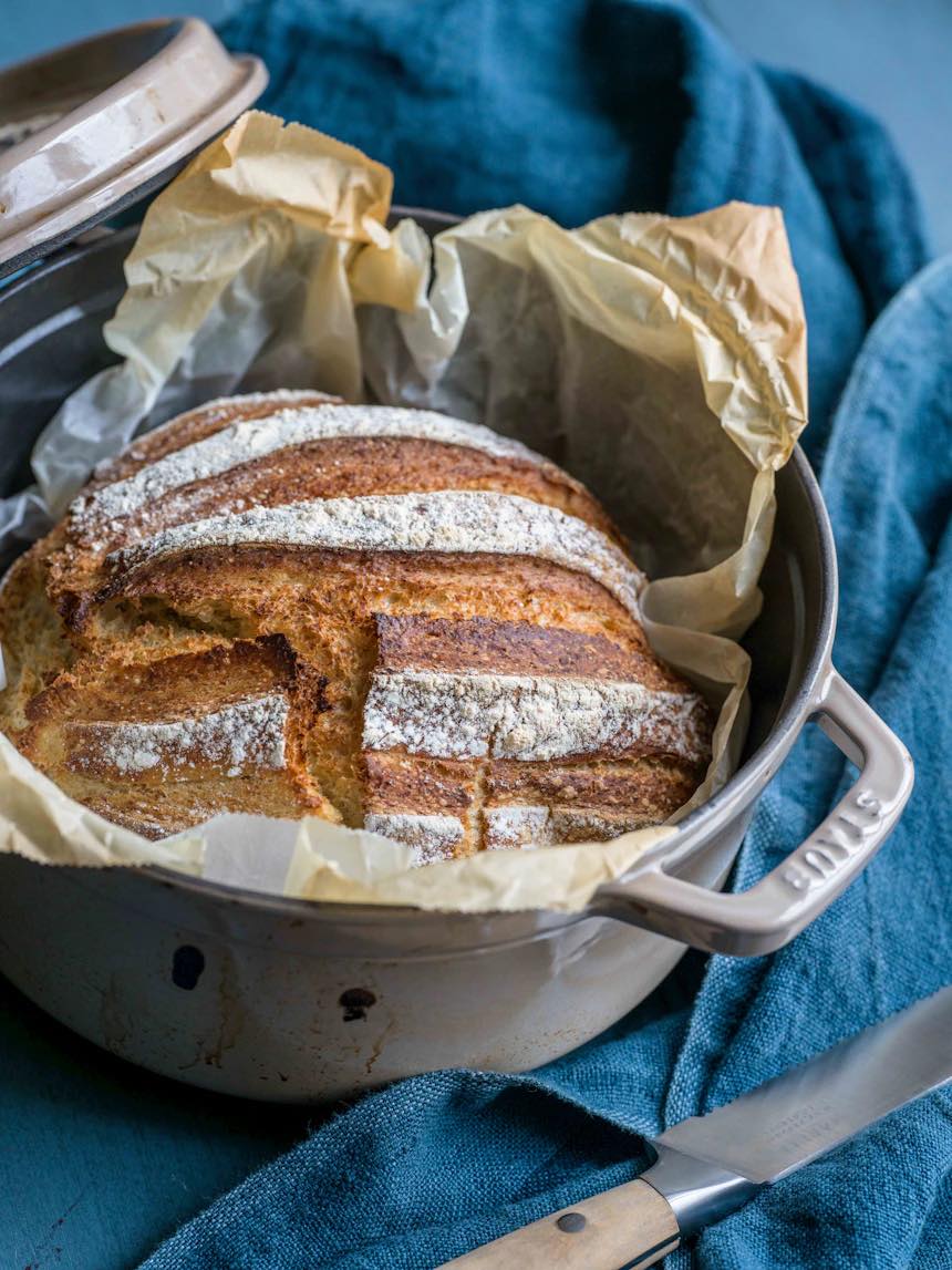 - Ta av locket och lägg i bakplåtspapperet med brödet i botten av grytan. Lägg på locket och baka mitt i ugnen 25 minuter.
