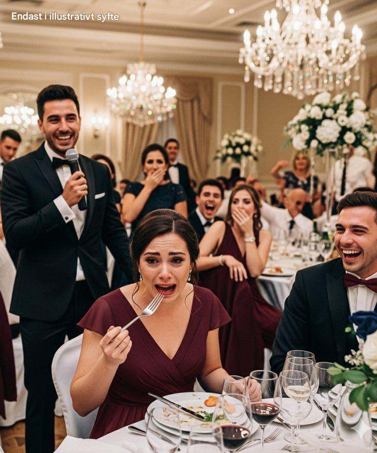 Tallrikar anlände snabbt till varje bord. Gästerna skrattade, klirrade med glasen och slukade sin mat medan servitörerna slingrade sig fram genom folkmassan med professionell lätthet. Linda väntade i tystnad, med händerna vilande på knäna, ett stelnat leende trots knuten som bildades i magen. När en servitör äntligen stannade till vid hennes bord, placerade han en kall tallrik på den: stelnade potatisar, vissnad sallad och en bit kyckling som såg ut som om den hade tagits från en annan gästs slängda tallrik.