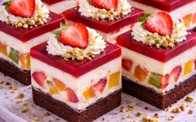 Tårta med grädde, frukt och jordgubbsgelé