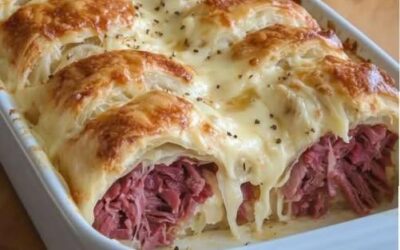 Denna bakade Reuben i croissanter ger en gemytlig twist till den klassiska delikatessmackan. Smakrik corned beef, syrlig surkål och smältande…