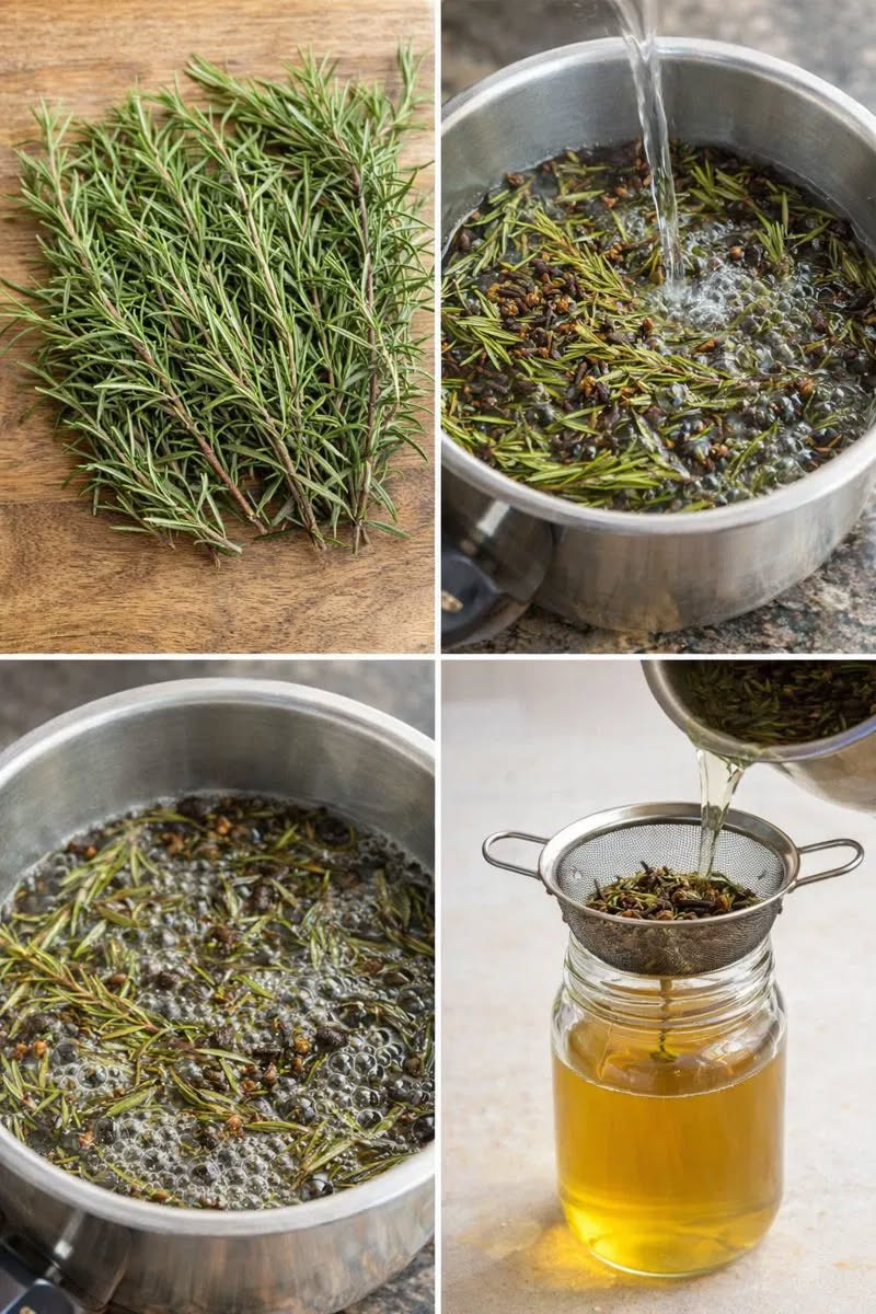 Rosmarin: Rosmarin är känt för sina antibakteriella egenskaper och effektivitet mot mjäll, och ger även håret naturlig glans. Tillsätt 2 till 4 kvistar rosmarin i din blandning.