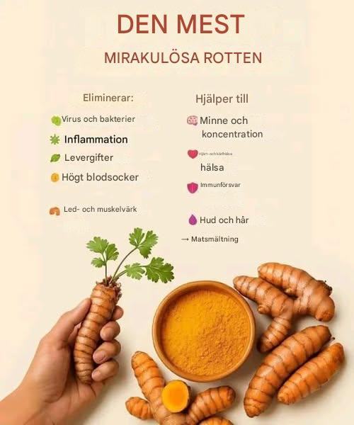 - Gurkmeja innehåller curcumin, en förening med potenta antiinflammatoriska, antioxidanta och antimikrobiella effekter.