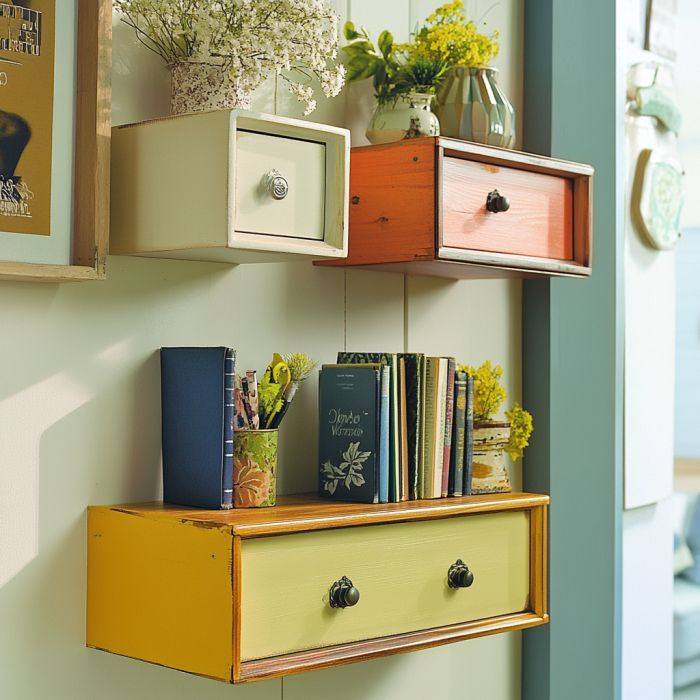 Gamla lådor kan enkelt omvandlas till eleganta hyllor. Genom att helt enkelt montera dem på väggen kan du skapa en visuellt tilltalande uppställning för böcker, växter eller dekorativa föremål. Slipa ner lådan, måla eller betsa den för att matcha din inredning och fäst den ordentligt på väggen med hjälp av konsoler. För en extra touch kan du överväga att klä insidan med tapet eller tyg för att skapa en färgklick eller ett mönster.