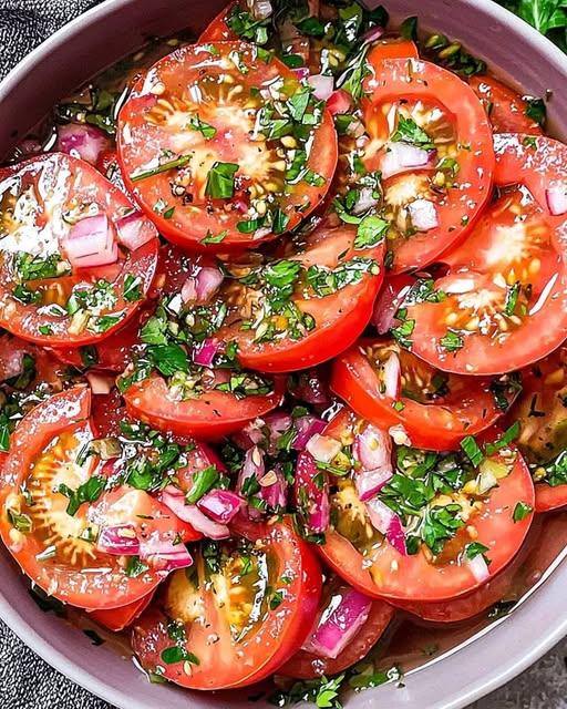 En färgglad och doftande sallad med mogna tomater marinerade i en örtvinägrett.