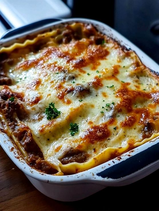 6. Nu Àr det dags att montera mÀsterverket: lÀgg ut ett lager lasagne, lÀgg pÄ svamp- och korvmixen, en klick béchamelsÄs och en nypa parmesanost.