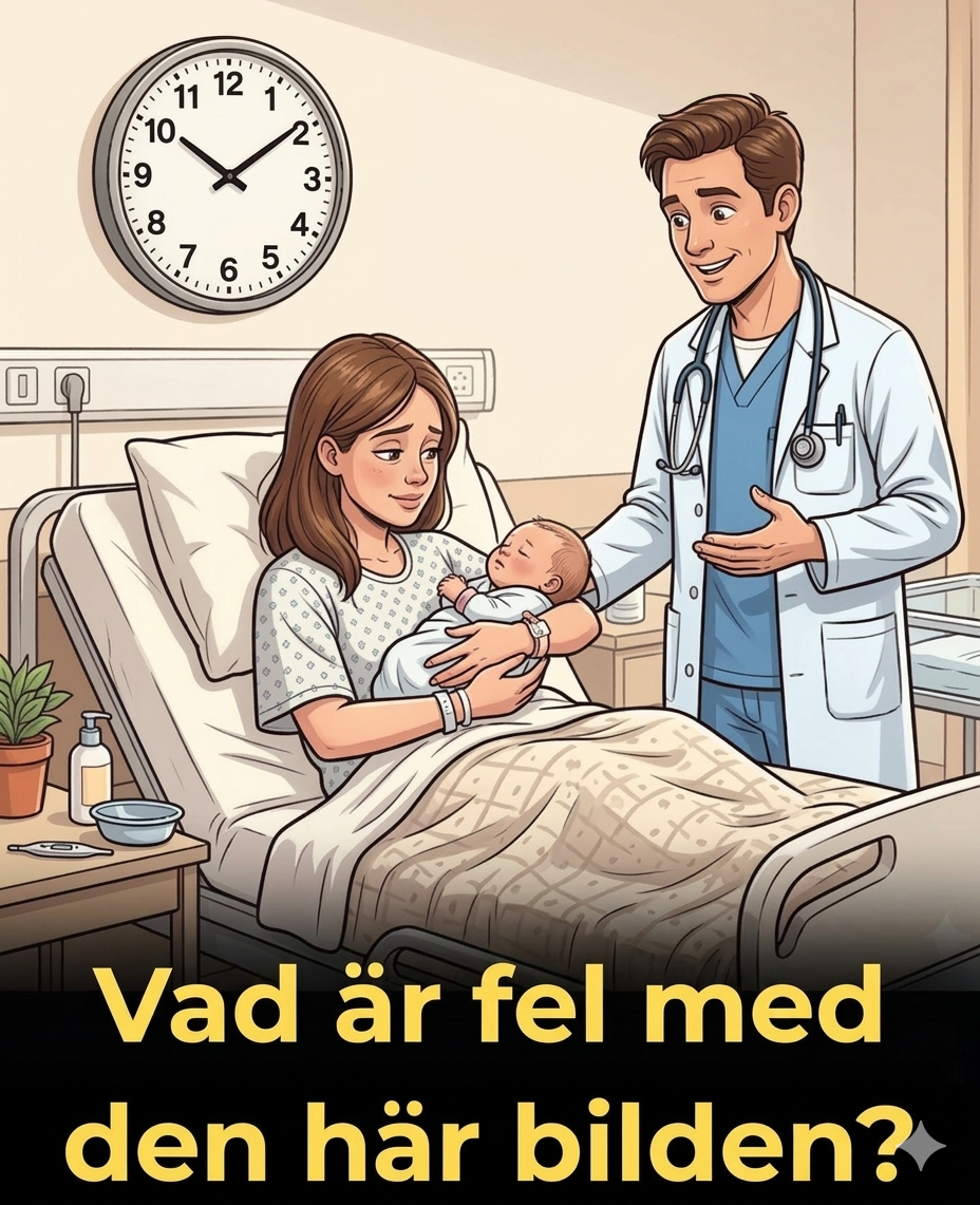 Vid första anblick ser vi en lugn scen: en nybliven mamma som ligger i en sjukhussäng och håller sitt nyfödda barn. En läkare står bredvid henne och ler, allt verkar tryggt och normalt. Men… det finns ett misstag i bilden. Ett litet detaljfel som många missar.